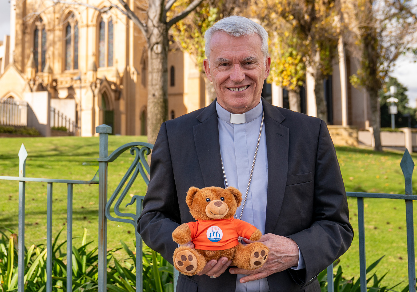 Archbishop Costelloe holds a teddy as part of the End Child Poverty campaign. Photo: Michelle Tan.
