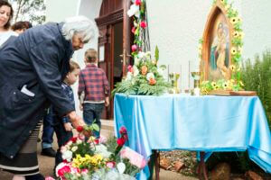 Pilgrims bringing their gifts of flowers to Mary by placing them in front of a large pilgrim shrine image at the annual Mary Pilgrimage at the Schoenstatt Shrine, Mt Richon WA. Photo: Chris Quinn.