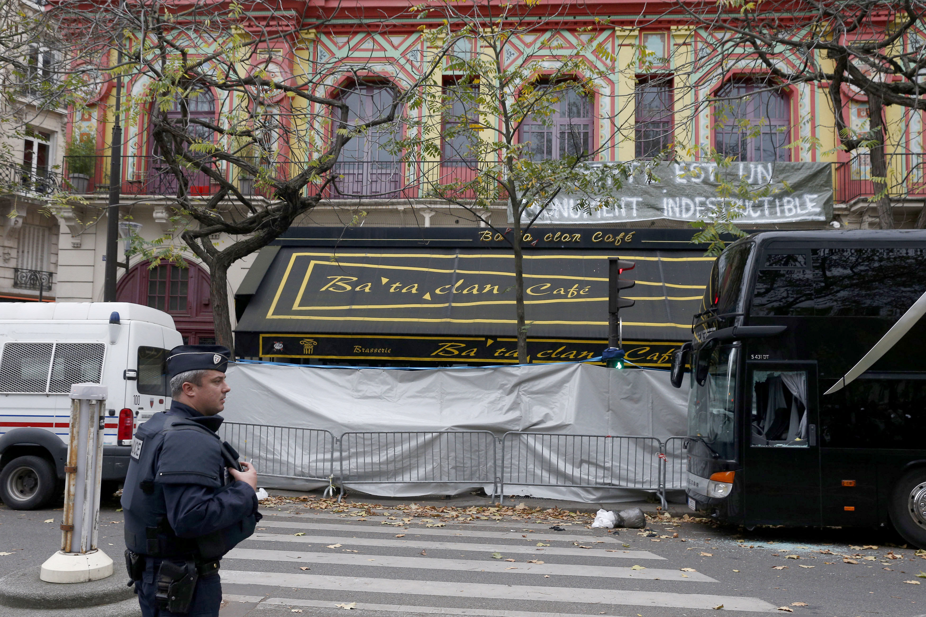 A policeman stands guard outside the Bataclan music hall in Paris on November 16. The Islamic State claimed responsibility for a November 13 attack on the hall. Photo: CNS/Paul Haring.