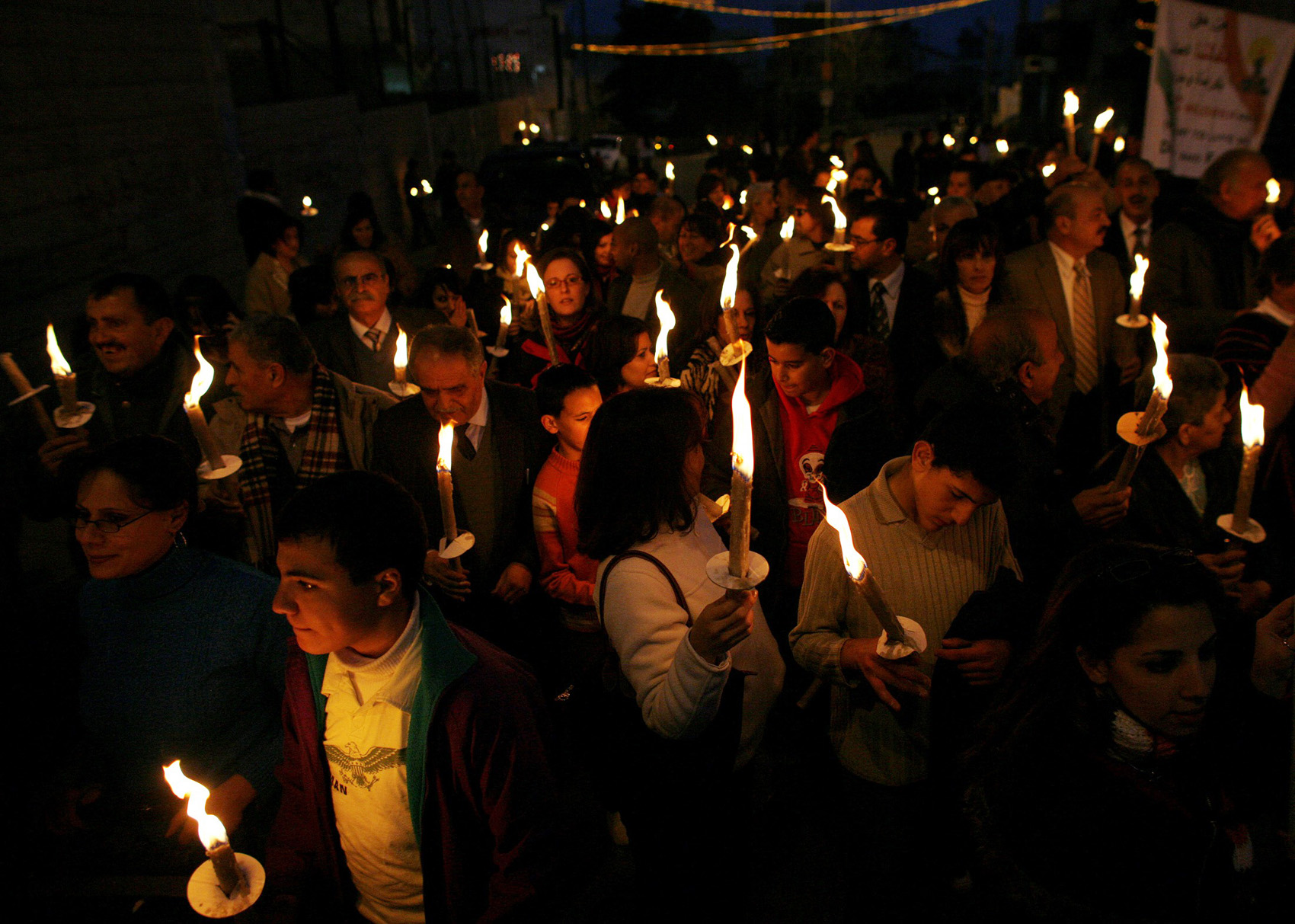 Palestinian and foreign activists hold candles during a procession calling for peace before Christmas in the West Bank village of Beit Sahour Dec. 21. (CNS photo/Stoyan Nenov, Reuters) (Dec. 21, 2007)