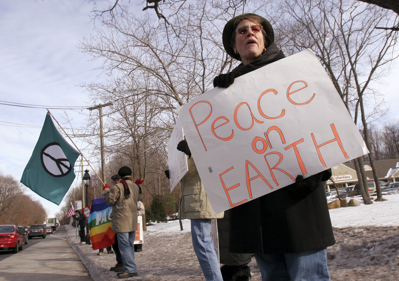 Catholic parishioner Mary Ann Hart takes part in a roadside peace rally in Setauket, N.Y., Dec. 15. Hart and her husband, Paul, are members of their parish peace and justice committee and among the founders of the North Country Peace Group, a community organization that opposes war. Members of the group have been assembling at the same intersection every Saturday since December 2002. (CNS photo/Gregory A. Shemitz) (Dec. 17, 2007)