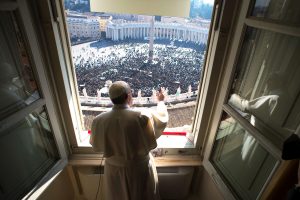 Pope Francis greets the crowd as he leads the Angelus from his studio overlooking St. Peter’s Square at the Vatican Jan. 29. (CNS photo/L’Osservatore Romano, handout)