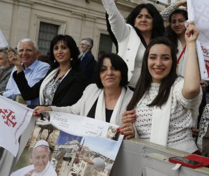 Home|Catholic convent, Maronite village latest targets of vandals in Israel|Pilgrims from Nazareth, Israel, hold poster advertising Pope Francis’ May 24-26 trip to Holy Land as they wait for start of general audience