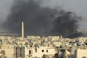 Smoke rises amid buildings in Aleppo, Syria, Sept. 4. Even with just war theory as a guide, analysts say the answers remain murky to moral and ethical questions about whether a military strike is the appropriate response to what U.S. officials believe was a chemical weapons attack on Syrian civilians. (CNS photo/Ammar Abdulla, Reuters) (Sept. 6, 2013) See SYRIA-JUSTWAR Sept. 6. 2013.