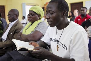 A man attends weekday Mass at the archdiocesan headquarters in Abuja, Nigeria, in this 2010 file photo. Over the last few years “Nigeria has been the most dangerous place in the world for Christians,” said a new report on persecution from Aid to the Church in Need. (CNS file photo/Nancy Phelan Wiechec) (Oct. 18, 2013) See PERSECUTION Oct. 18, 2013.