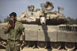 An Israeli soldier prays in front of tank at staging area near border with Gaza Strip