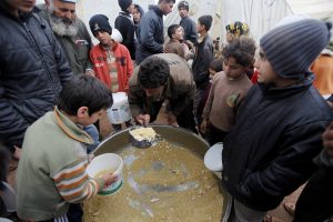 Syrian refugees collect food at refugee camp at Syrian-Turkish border