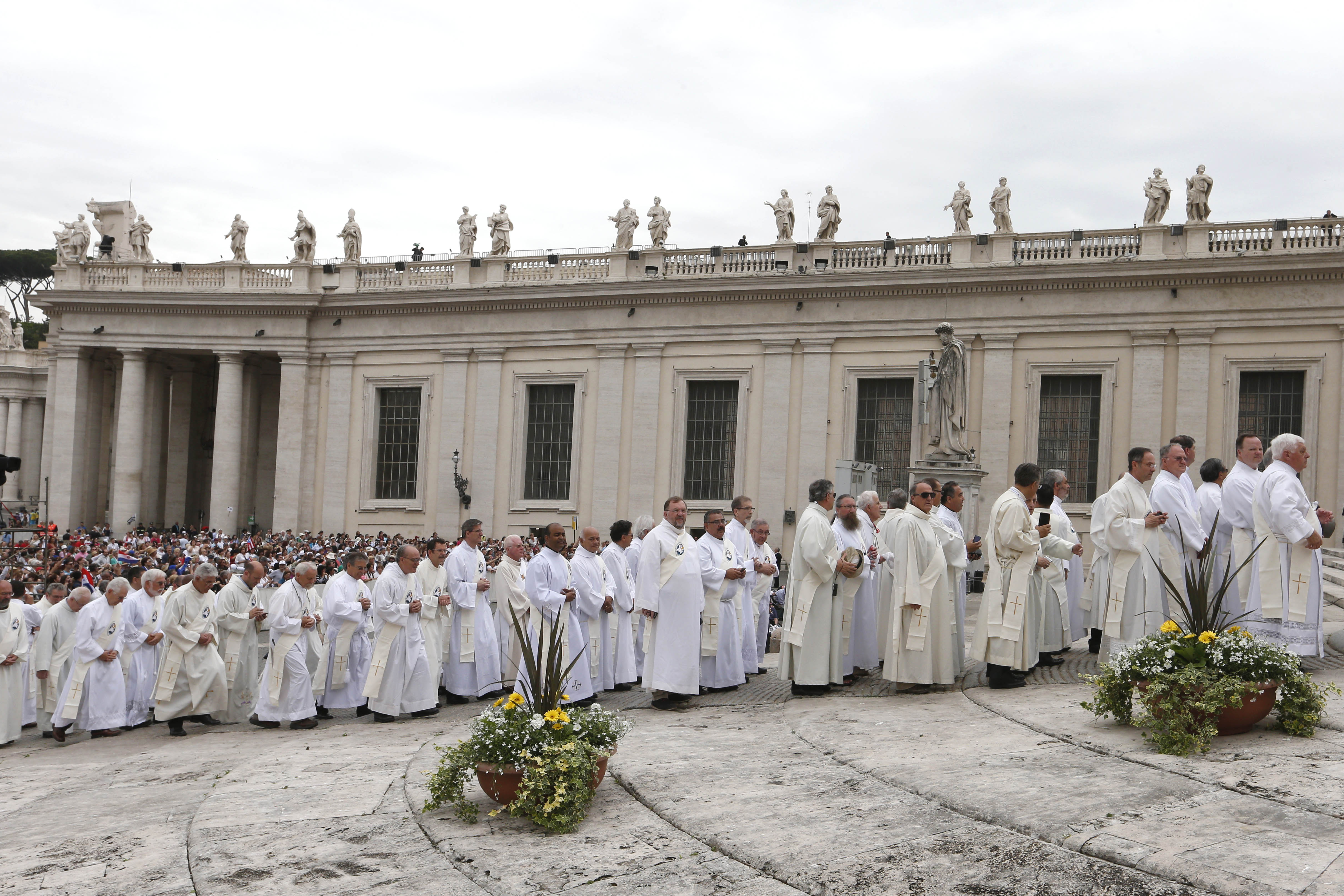 Deacons process to their seats near the altar as they arrive for Pope Francis’ celebration of a Mass for the Jubilee of Deacons in St Peter’s Square at the Vatican on May 29. The Mass was a celebration of the Holy Year of Mercy. Photo: CNS/Paul Haring.