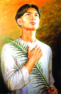 A painting of Blessed Pedro Calungsod shows him holding a palm frond. The young missionary catechist from Cebu, Philippines, was martyred the day before Palm Sunday in 1672 in Guam. He will become the second saint from the Philippines when he is canonized Oct. 21. (CNS photo/courtesy of Cebu Archdiocesan Shrine of Blessed Pedro Calungsod) (Aug. 14, 2012) See PROFILE-CALUNGSOD Aug. 14, 2012.