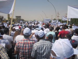Christian refugees march against persecution by Islamic State fighters outside the U.N. compound near the airport in Irbil, Iraq, July 24. Christians braved temperatures as high as 122 degrees Fahrenheit to make their voices heard. (CNS photo/Sahar Mansour) (July 28, 2014) See MOSUL-CONCERN, July 28, 2014.