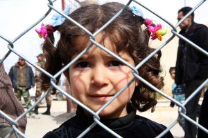 A displaced Syrian girl finds temporary shelter at a school in Damascus, Syria, Feb. 23. A prominent Syrian Christian political leader has called for U.S.-led coalition forces to use airstrikes to aid fellow Syrian Christian and Kurdish fighters battling Islamic State militants in northwest Syria following reports of flagrant abductions and church burnings. (CNS photo/Youssef Badawi, EPA) See SYRIA-APPEAL Feb. 25, 2015.