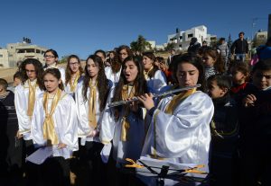 Young people from the Yasmeen Choir from the Magnificat Institute School for Music in Jerusalem perform on a field cleared of land mines in the West Bank village of Husan, near Bethlehem, Dec. 23. The mines were removed by deminers — both Israeli and Palestinian — from Roots of Peace in May. Roots of Peace has embarked on an international campaign to turn Mines to Vines in the Holy Land. (CNS photo/Debbie Hill) (Dec. 23, 2013)