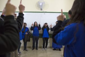 Students pray in classroom after distributing aid during first Youth of Life visit in Beirut