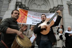 Members of the Neocatechumenal Way sing and play instruments outside the Cathedral Basilica of the Sacred Heart in Newark, N.J., Nov. 5 before the Mass of welcome for Coadjutor Archbishop Bernard A. Hebda of Newark. Archbishop Hebda had been bishop of Gaylord, Mich., before Pope Francis appointed him coadjutor of Newark, where he automatically succeeds Archbishop John J. Myers, upon his retirement or death. (CNS photo/Gregory A. Shemitz) (Nov. 6, 2013) See HEBDA-WELCOME Nov. 6, 2013.