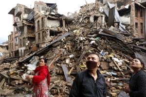 Survivors look at destroyed buildings following earthquake in Nepal