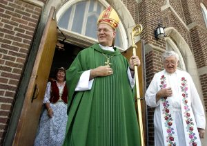 Hungarian Cardinal Peter Erdo smiles at parishioners following Mass at Holy Trinity Hungarian Church in East Chicago, Ind., July 10. At age 52, Cardinal Erdo, archbishop of Esztergom-Budapest, is the youngest member of the College of Cardinals. He was in the United States for several weeks this summer visiting Hungarian Catholic communities, U.S. bishops and attending a canon law conference in Washington. (CNS photo by Karen Callaway, Northwest Indiana Catholic) (July 16, 2004)
