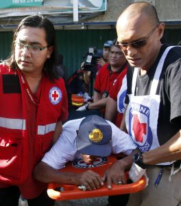 Philippine Red Cross personnel carry wounded hostage after he rescue by government soldiers in Philippines