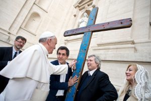 Home|Pope: Cross isn’t an ornament, Christianity isn’t a do-gooder’s guide|Pope Francis blesses a cross made from wooden boards from boats used by migrants during weekly audience at Vatican