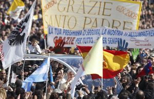 Signs salute Pope Benedict XVI with words of gratitude as he arrives to lead his final general audience in St. Peter’s Square on Feb. 27 at the Vatican.