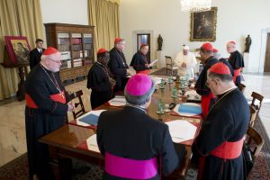 Pope Francis prays during meeting with cardinals at Vatican