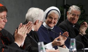 Sister Sharon Holland, president of the Leadership Conference of Women Religious, second from left, receives applause after speaking at a Dec. 16 Vatican press conference for release of the final report of a Vatican-ordered investigation of U.S. communities of women religious. From left are: Brazilian Cardinal Joao Braz de Aviz, prefect of the Congregation for Institutes of Consecrated Life and Societies of Apostolic Life; Sister Holland; Sister Agnes Mary Donovan, coordinator of the Council of Major Superiors of Women Religious; and Jesuit Father Federico Lombardi, the Vatican spokesman. The 5,000 word report summarizes problems and challenges the women see in their communities and thanks them for their service. The visitation was carried out between 2009 and 2012. (CNS photo/Paul Haring) See VATICAN-RELIGIOUS and RELIGIOUS-PRESENTATION Dec. 16, 2014.