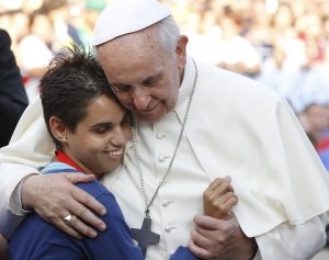 Pope Francis embraces a young woman during an encounter with youth in Cagliari, Sardinia, Sept. 22. (CNS photo/Paul Haring) (Sept. 23, 2013) See POPE-SARDINIA Sept. 23, 2013.