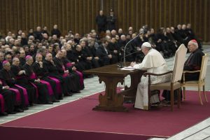 Prelates and priests look on as Pope Francis leads a meeting with priests in Paul VI audience hall at the Vatican March 6. The pope’s annual Lenten meeting with Rome pastors focused on the priest’s call to be a minister of mercy. (CNS photo/L’Osservatore Romano) (March 6, 2014) See POPE-PRIESTS March 6, 2014.