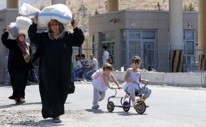 Syrian refugees carry their belongings as they enter the Turkish Cilvegozu border gate Sept. 4. The U.N. High Commissioner for Refugees said there had been a near tenfold increase over the past 12 months in the number of refugees crossing Syria’s borders into Turkey, Iraq, Jordan and Lebanon — to a daily average of nearly 5,000 people. (CNS photo/Umit Bektas, Reuters) (Sept. 4, 2013)