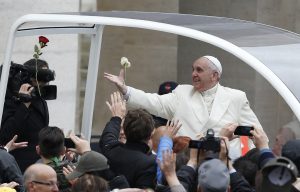 Home|Pope to politicians: Follow God’s love, reject self-serving corruption|Pope attempts to catch roses as he arrives for general audience in St. Peter’s Square at Vatican