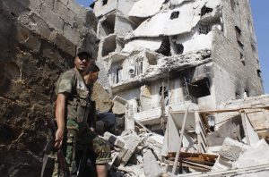 Free Syrian Army fighters stand in front of buildings damaged by what activists said was shelling by forces loyal to Syrian President Bashar Assad in the old city of Aleppo Sept. 2. During the Sept. 1 Angelus, Pope Francis announced he would lead a worldwide day of fasting and prayer for peace in Syria Sept. 7. (CNS/Molhem Barakai, Reuters) (Sept. 3, 2013) See POPE-VIGIL Sept. 3, 2013.