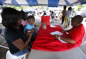 Lisa Smith, right, helps uninsured Danielle Winters, holding her 7-month-old grandson Tyler, sign up for the Affordable Care Act outside the Jackson-Hinds Comprehensive Health Center in Jackson, Miss. Catholic hospitals are among some of the groups and businesses helping people understand and apply for insurance under the new health care law. (CNS photo/Jonathan Bachman, Reuters) (Nov. 1, 2013) See WASHINGTON LETTER Nov. 1, 2013.