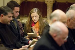 Young woman joins students and clergymen for prayer service to end world hunger at Catholic University of America chapel