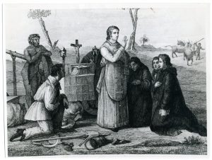 NN. “First mass in Western Australian bush’ Dom Salavado, Dontaine and O’Gorman, one of Scully’s servants receives Fr Serra’s blessing while a native watches. A child herds cattle in the background.