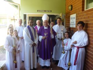 Flanked by past parish clergy and current acolytes and servers, Bishop Donald Sproxton was on hand with St Joseph Pignatelli Parish Priest Fr Sean Fernandez, at left, to join in the 50th anniversary celebrations for the Attadale parish church.