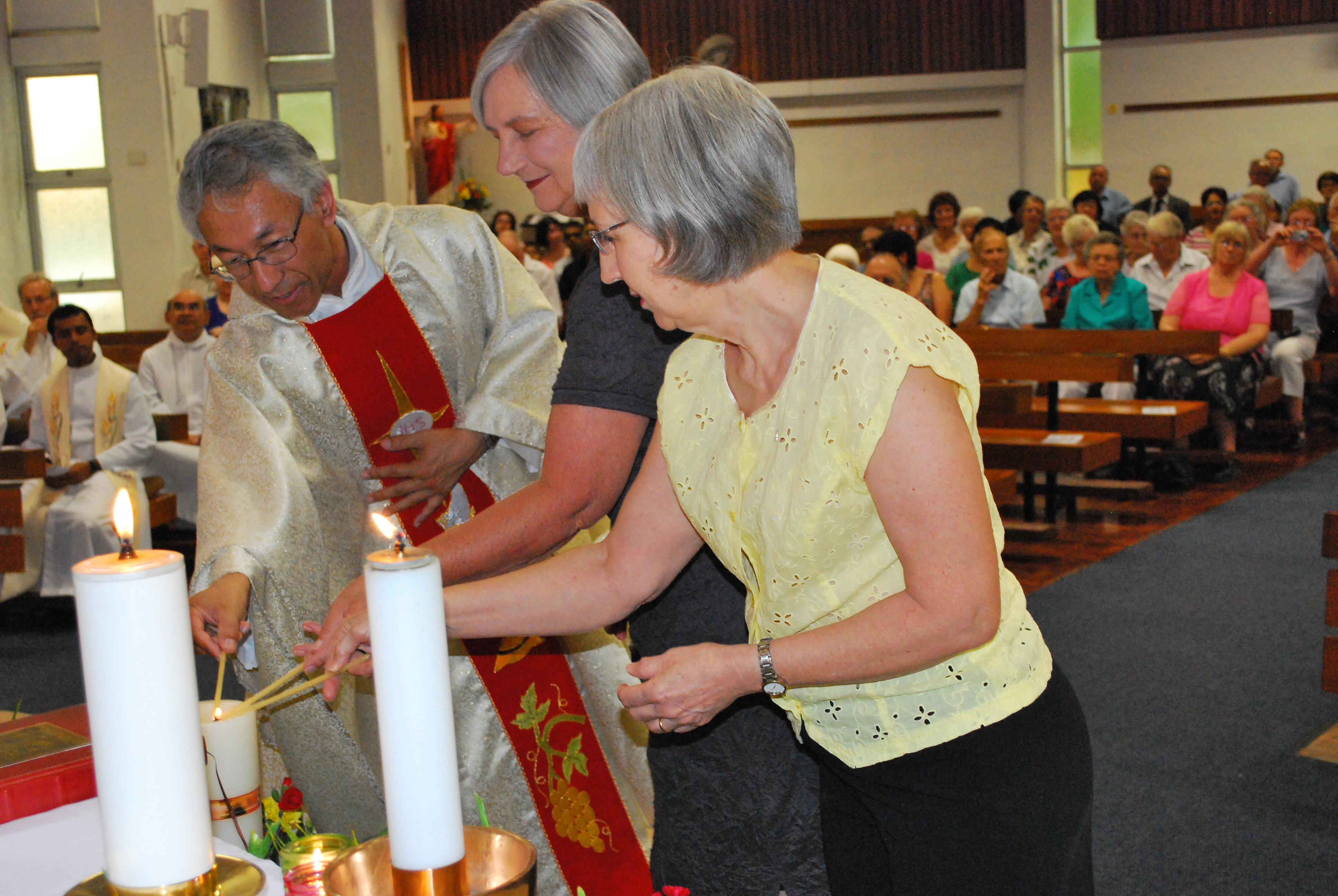 TRICIA WISOLITH, CHERYL SULLIVAN AND FR. EUGENE SAN SAC LIGHT THE JUBILEE CANDLE