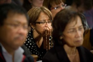 Woman prays rosary at national shrine in Washington as part of global rosary event