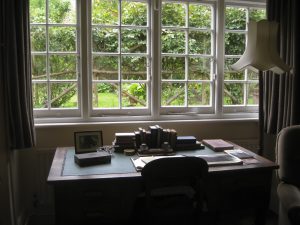 Desk overlooks garden at C.S. Lewis house in Oxford