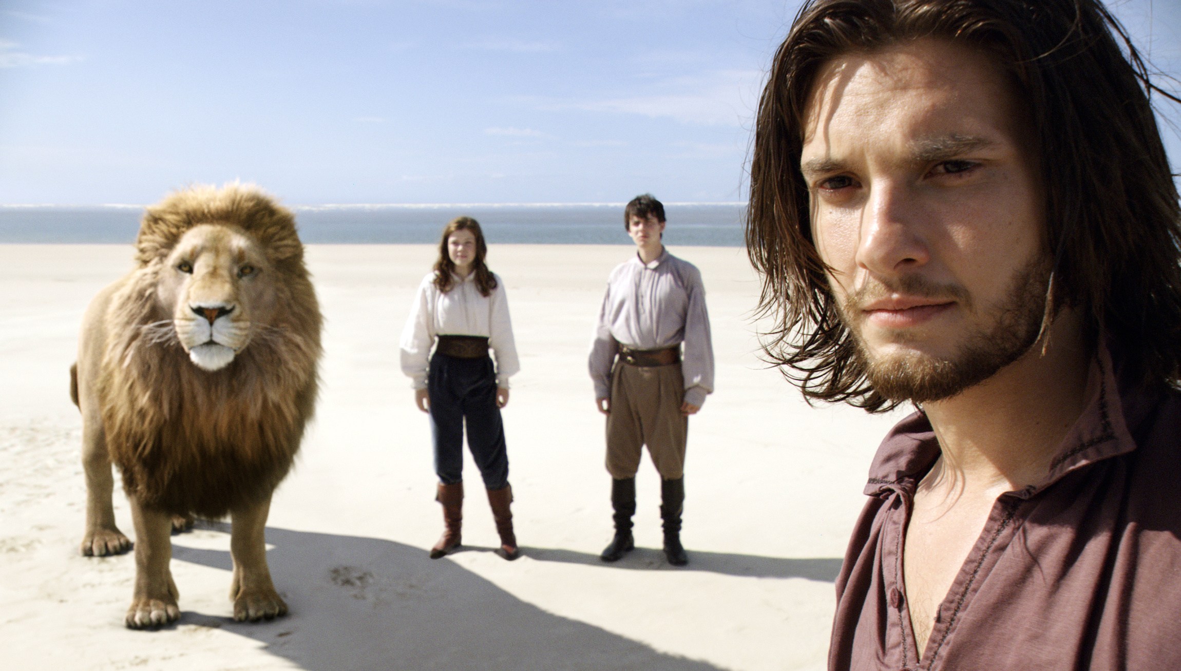 A lion named Aslan, voiced by Catholic actor Liam Neeson, Georgie Henley, Skandar Keynes and Ben Barnes are seen in the movie “The Chronicles of Narnia: The Voyage of the Dawn Treader.” The Motion Picture Association of America rating is PG — parental guidance suggested. (CNS photo/Fox) (Dec. 9, 2010) See MOVIE REVIEW (EMBARGOED) Dec. 9, 2010.