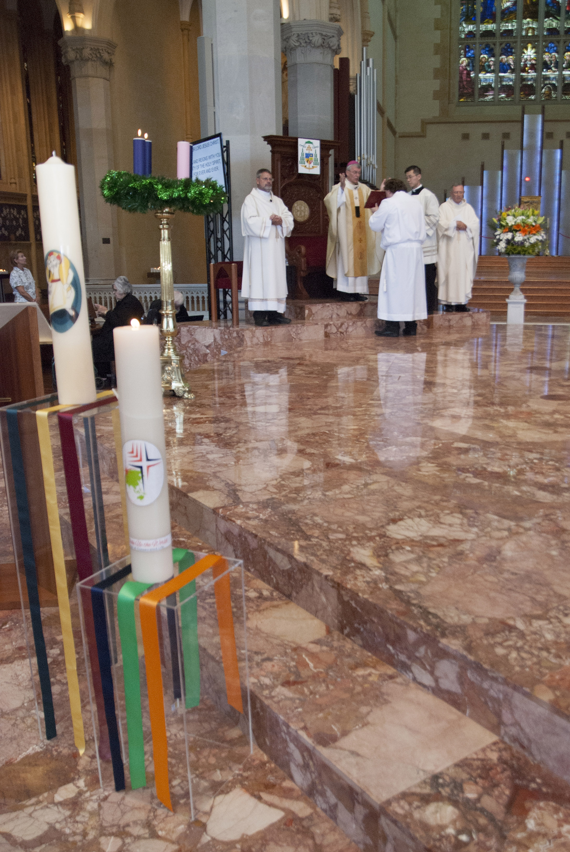 The two candles decorated with the Year of Mercy logo and Year of Consecrated Life logo. At the conclusion of the Mass, Archbishop Costelloe lit the Year of Mercy candle to commemorate the inauguration of the Jubilee Year, while also extinguishing the Year of Consecrated Life candle to symbolise its conclusion. Photo: Jamie O’Brien