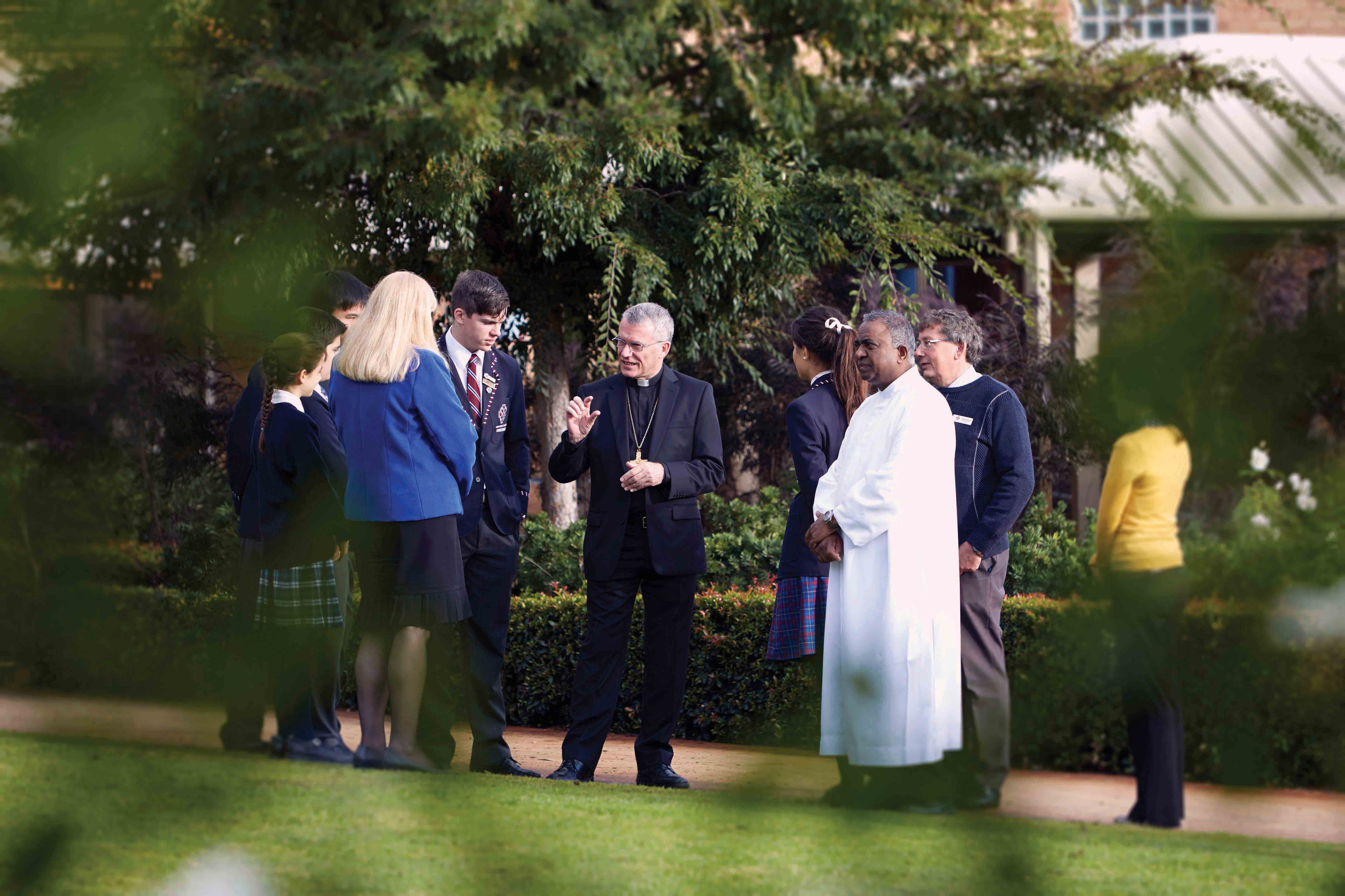 Archbishop Costelloe in discussion with students and staff of Corpus Christi College. Photo: Ron Tan