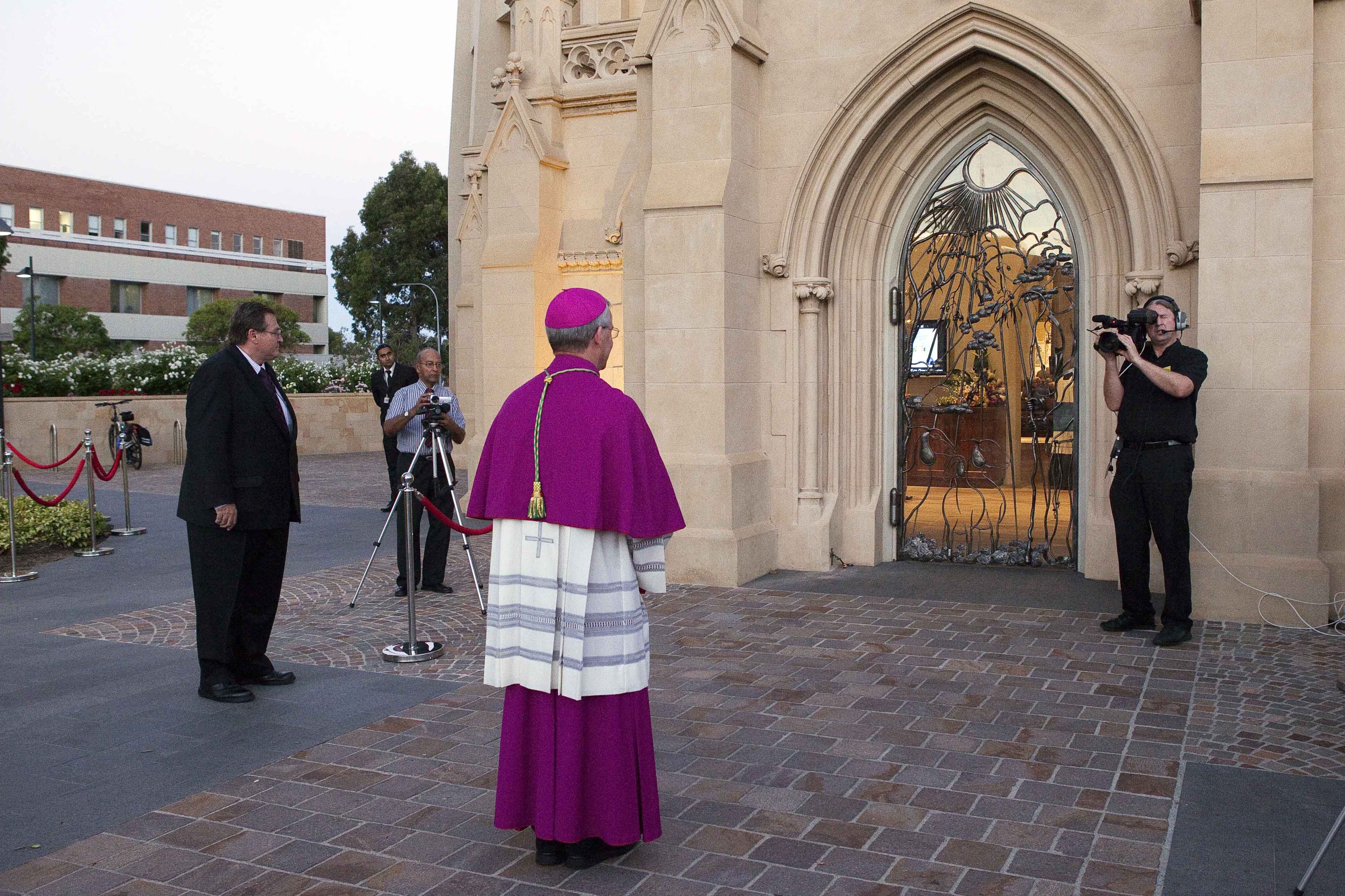 Archbishop Timothy Costelloe prepares to enter the Holy Door at his installation Mass on 21 March 2012. Archbishop Costelloe will this month celebrate the commencement of the Jubilee Year of Mercy with the opening of the Holy Door at St Mary’s Cathedral on 12 December. Photo: Ron Tan