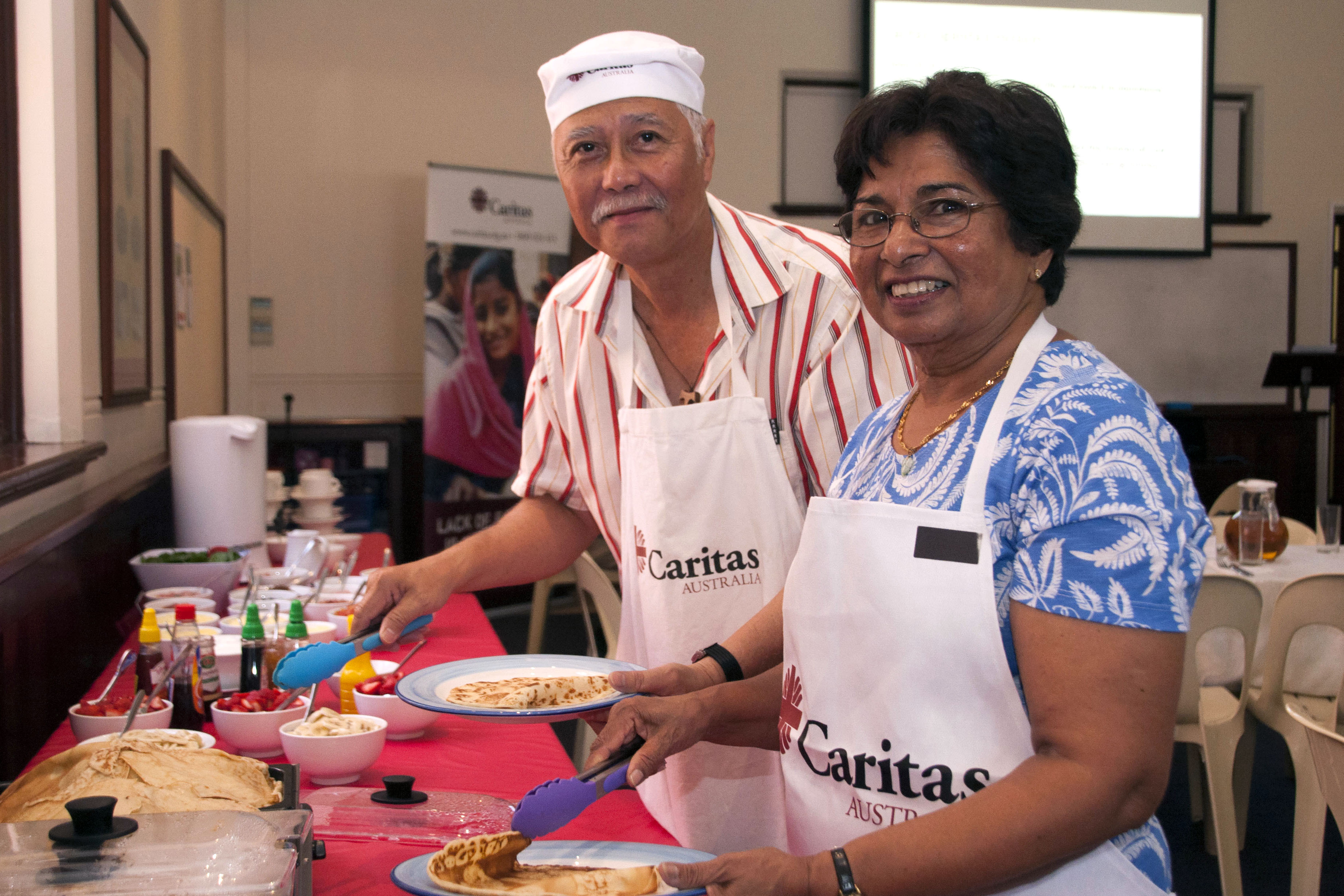 Cooks responsible for preparing the pancake lunch, Dominic Chew and Margaret Yesuratnam, help themselves to the fruits of their labour at the Caritas Shrove Tuesday pancake lunch. Photo: Marco Ceccarelli.