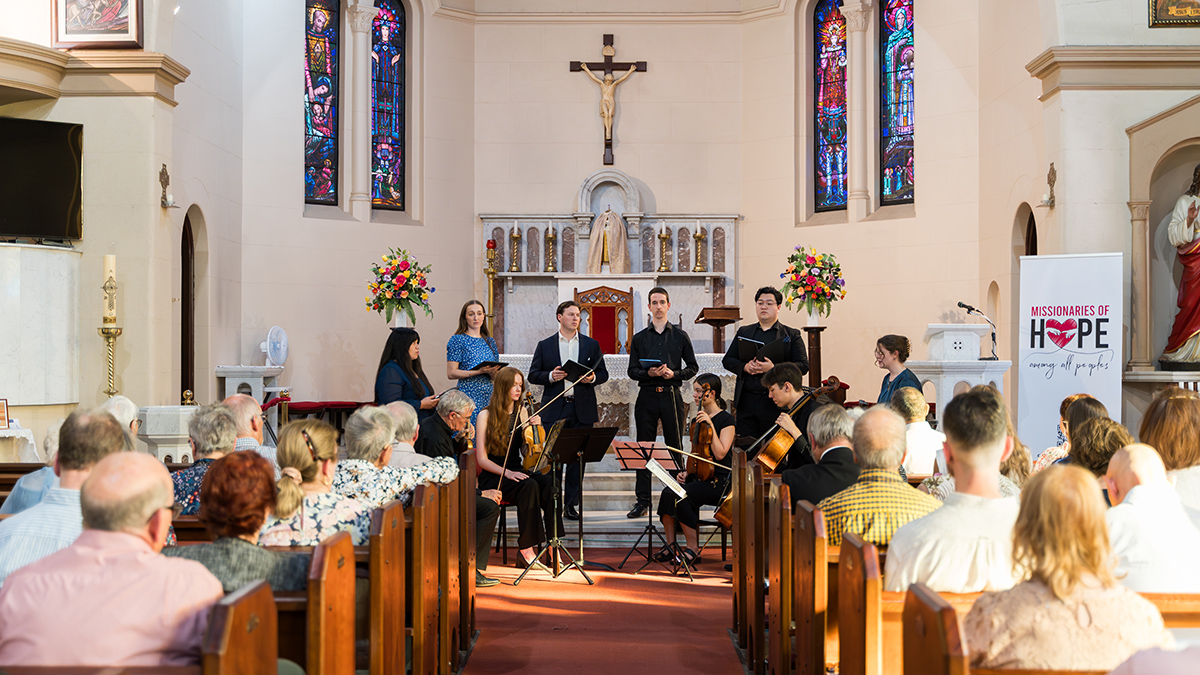 Over the Mother’s Day weekend, Catholic Mission held its second annual Mother’s Day Afternoon Concert at St Columba’s Church in South Perth. Titled ‘Mother of Hope’, this year’s inspirational and thought-provoking programme of sacred instrumental and choral music was put together and performed by Paul Wright and Emma Spadaccini, one of Perth’s renowned violinist and soprano respectively, along with their Mother’s Day String Quartet of violins, viola and cello and their choral ensemble of six. Beginning with Paul Wright’s Ave Maria on solo violin, the hour-long programme showcased an amazing potpourri of string and choral music from the 16th to the 21st century, by John Taverner, Gustav Holst, Anton Dvorak, Ola Gjeilo and JS Bach with the finale being a powerful rendition of Jacques Arcadelt’s Ave Maria with both the string quartet and choral ensemble in full flight.