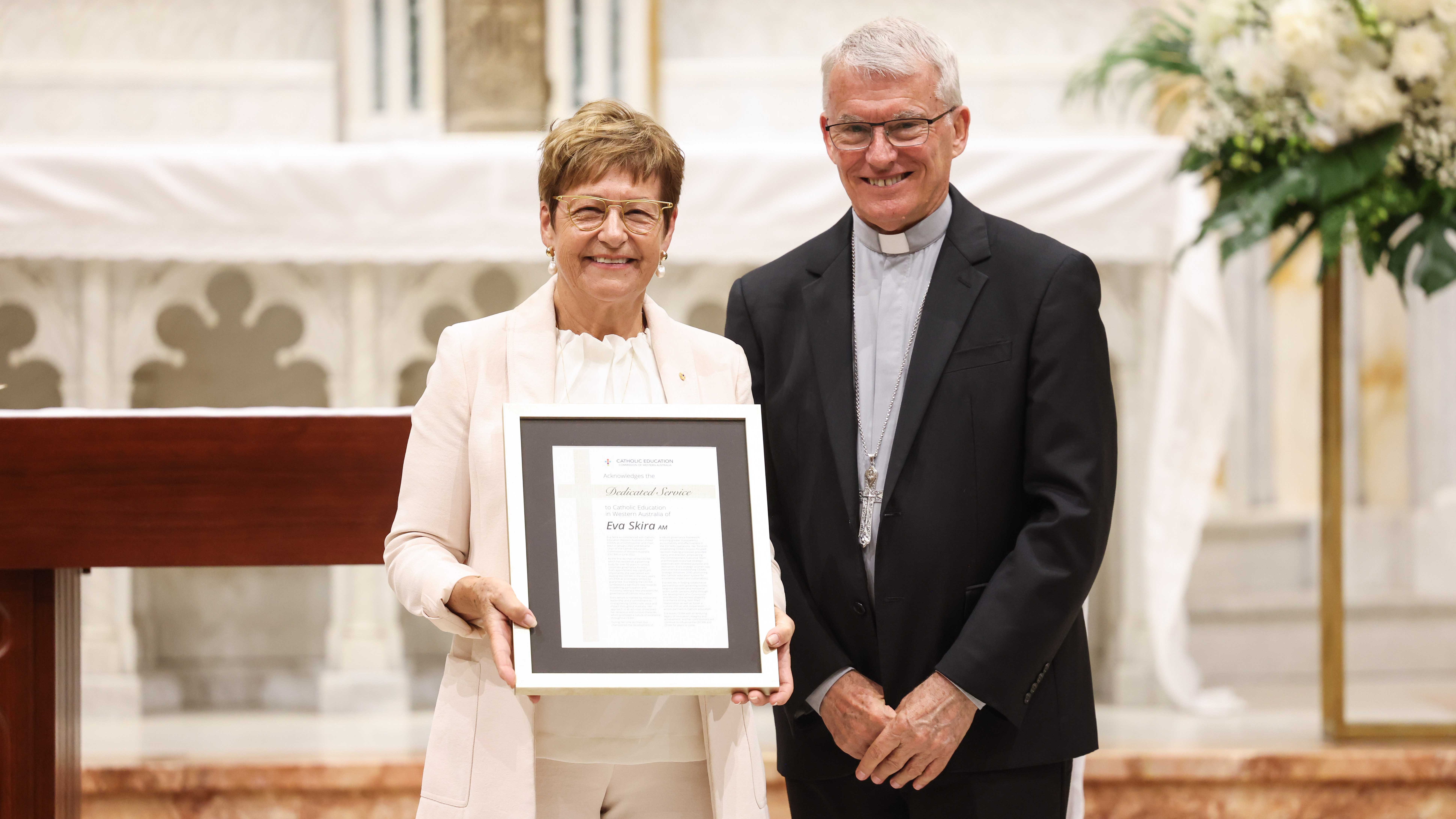 Archbishop Costelloe SDB with Outgoing CEWA Commissioner, Eva Skira. Photo: Matt Biocich/Supplied.