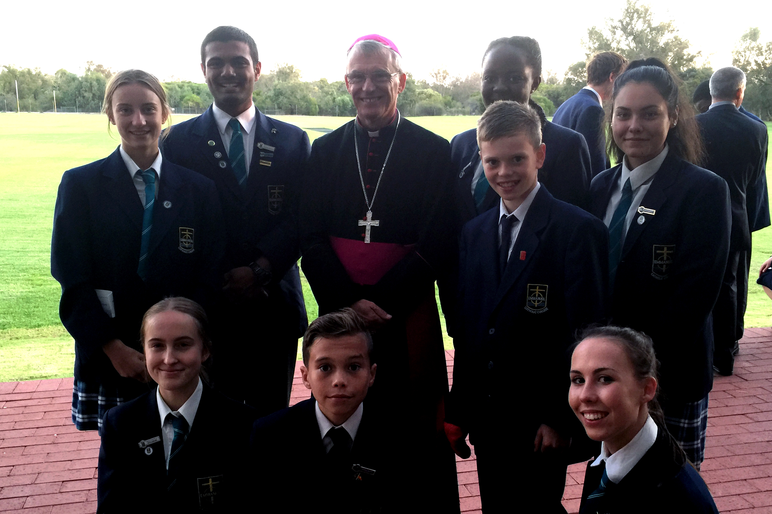 Archbishop Costelloe with students from Emmanuel College at the opening of the new Sport and Performing Arts Centre on Wednesday April 6. Photo: Jamie O’Brien.