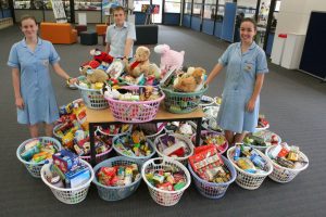 Rockingham students, christine, conner and skye, with the hampers they assembled.