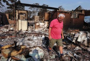 Alan Seaman walks through the remains of his home that was destroyed by a bush fire in the Blue Mountains suburb of Winmalee, Australia, Oct. 21. Australian authorities have declared a state of emergency for New South Wales as 2,000 firefighters battle the region’s worst bush fires in more than 40 years. (CNS photo/David Gray, Reuters) (Oct. 21, 2013) See AUSTRALIA-FIRES Oct. 21, 2013.