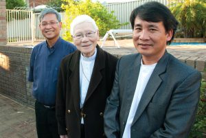 Bishop Paul Cao Dinh Thuyen, centre, the retired bishop of Vinh diocese in central Vietnam, says indefinite imprisonment awaits many Vietnamese asylum seekers whose claims are rejected. Bishop Paul, pictured with Vietnamese Catholic Community Chaplain, Fr Huynh Nguyen, left, and Fr Dinh Van Quynh, urged the immigration department to accept the claims of 26 detainees in Northam. PHOTO: ROBERT HIINI